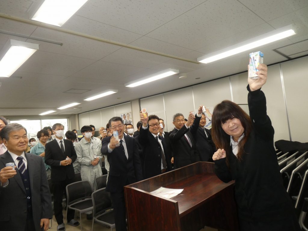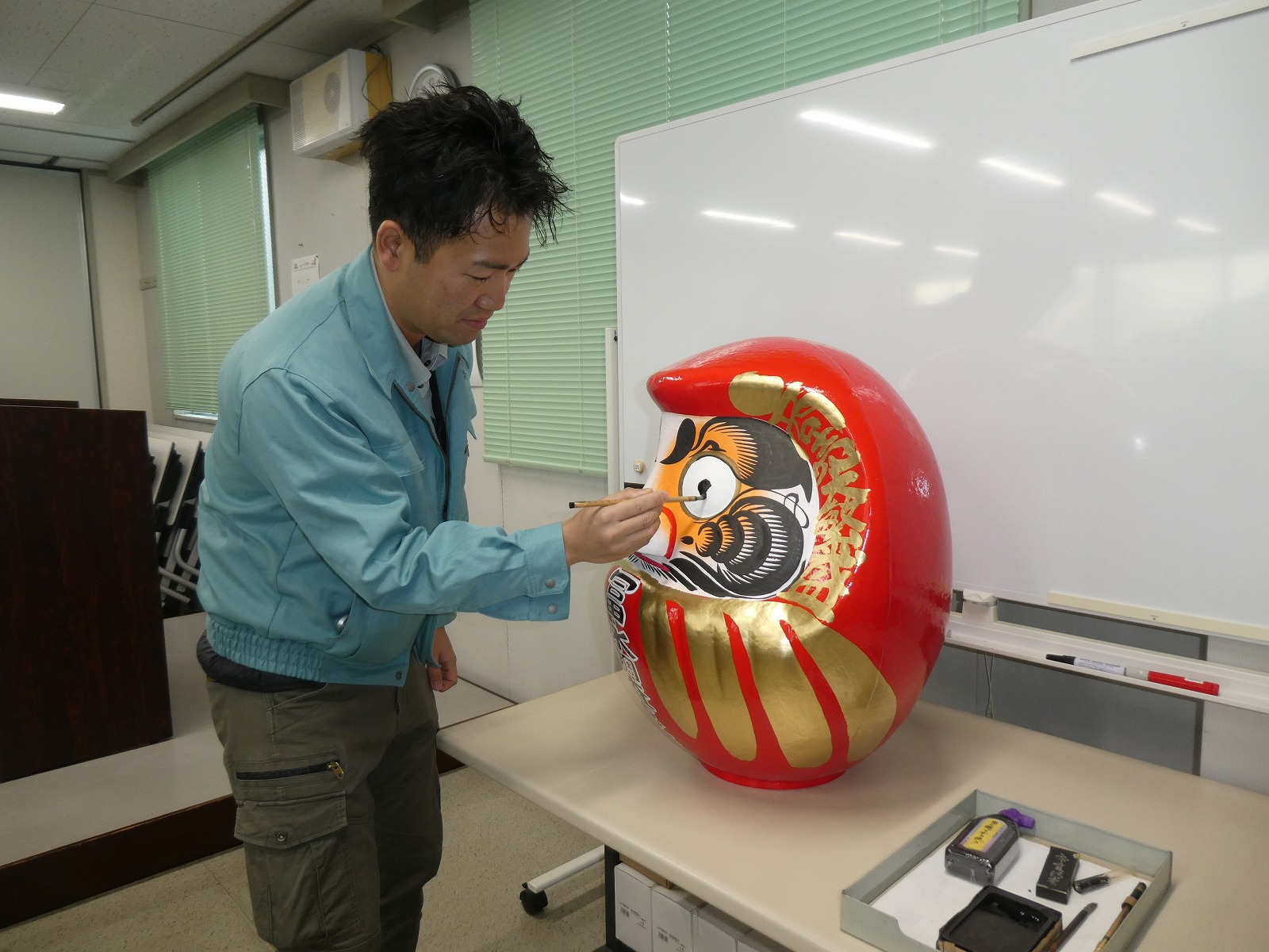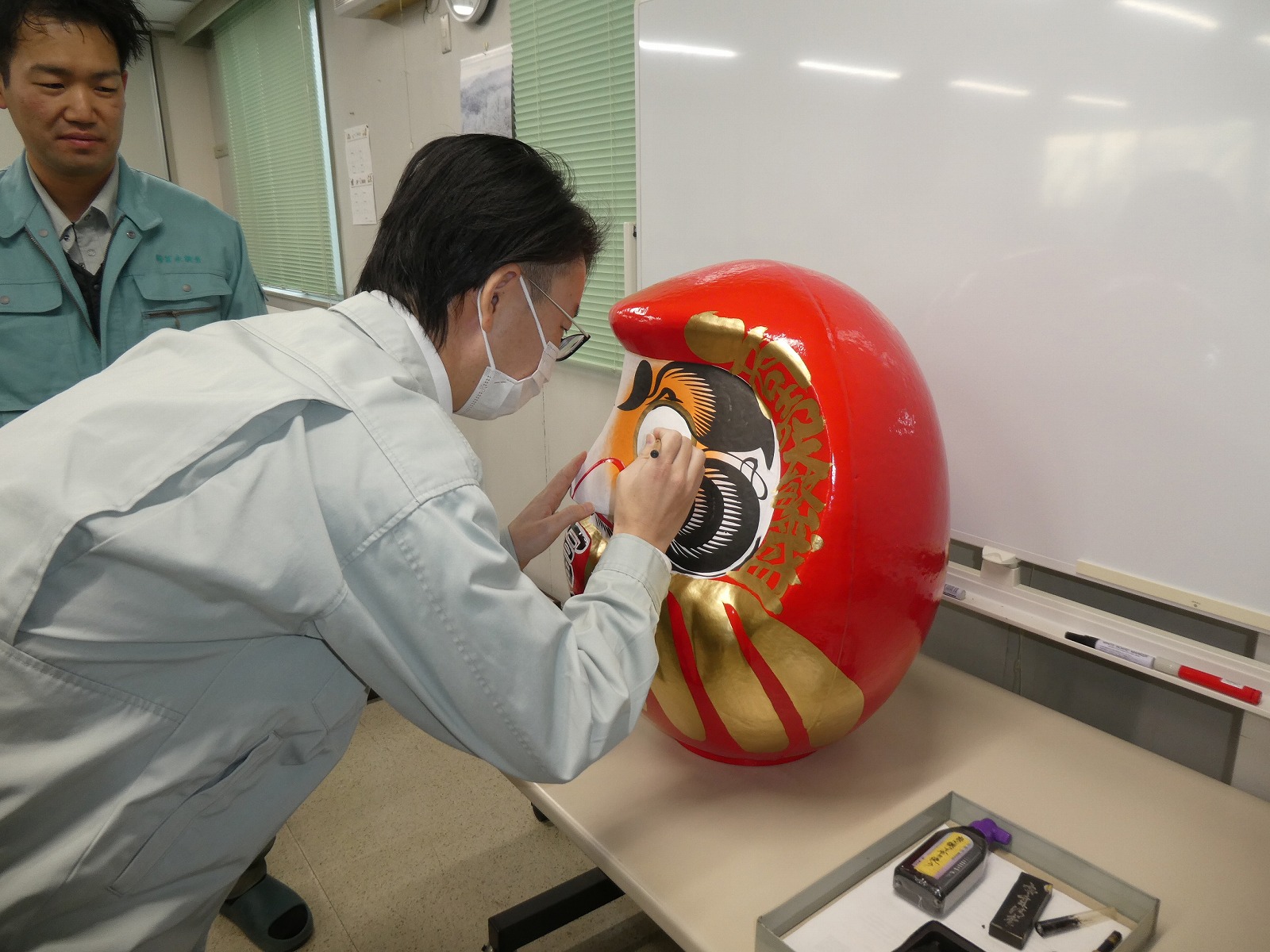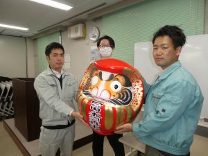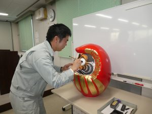 年男の社員に商売繁盛を願ってだるまの左目をいれてもらいました。